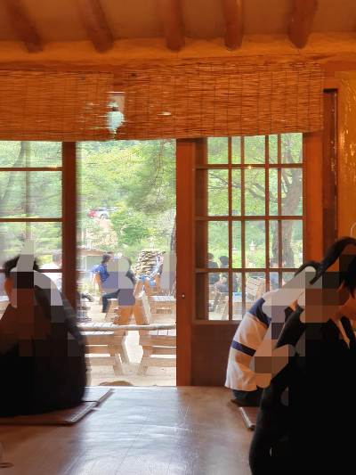 4인 테이블씩 코로나 때문에 칸막이를 해서 위생과 안전에도 신경 쓴 느낌이에요. 식사를 하면서 바깥 푸르른 자연을 보면서 음식을 먹으니 더 건강해지는 맛이에요.