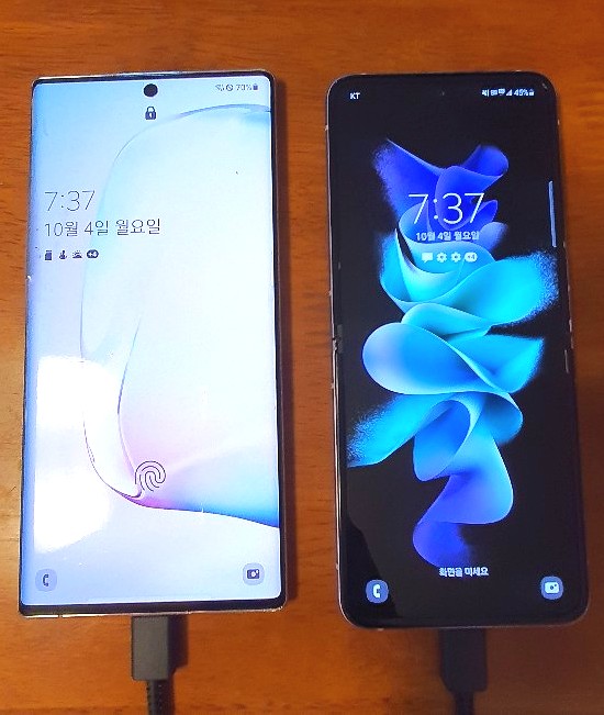 왼쪽이 기존 갤럭시노트10+이고 오른쪽이 갤럭시 z플립 3 에요. 저렇게 나란히 놓고 비교하니 확실히 폭은