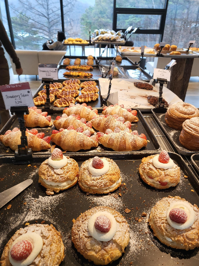 카페 2층에는 커피주문과 다양한 베이커리가 준비되어 있어요. 베이커리 종류도 많아서 골라 먹는 재미가 있는 것 같아요. 커피 가격은 좀 비싼 편이지만 이런 야외 공간에 나와 마시는 커피이니만큼 이 정도 가격은 할 거라고 예상은