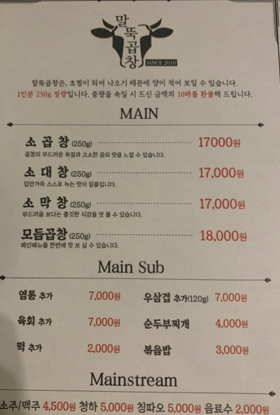 모듬곱창 1인분 18.000