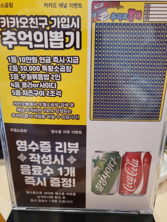 기본 반찬을 세팅해 주시고 메인 곱창이 나올때까지 기다리고 있으니 직원분께서 오셔서 카톡 친구 추가하면 뽑기 할 수