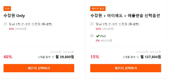 저는 아이패드가 있기 때문에 수강권 Only를 선택하였어요. 오른쪽에 보면 수강권뿐 아니라 아이패드까지 패키지로
