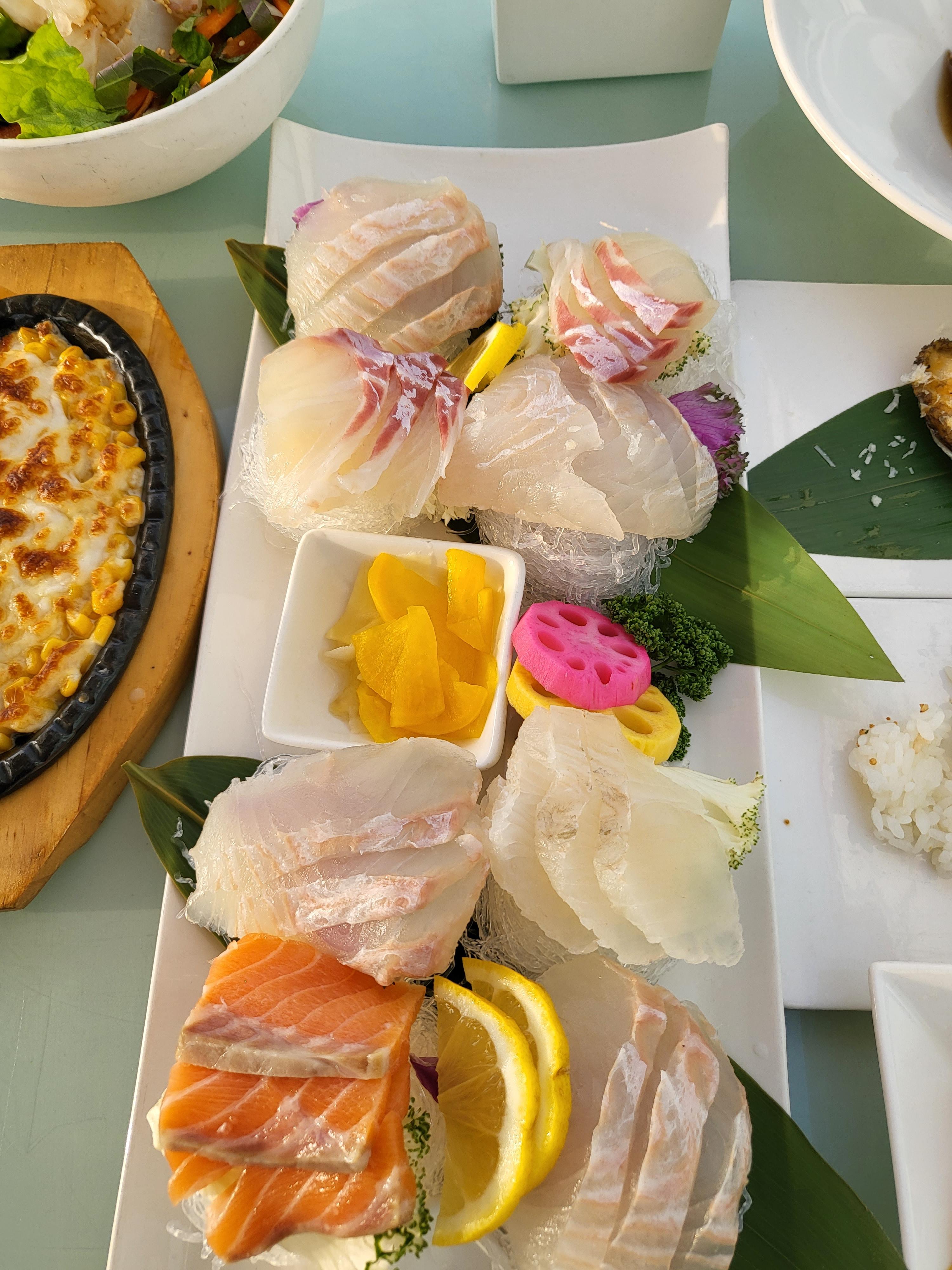저희는 생선회 세트를 시켰어요. 음식들이 순서대로 나오는데요. 테이블의 크기가 컸는데도 꽉 채워지는 음식들을 보니