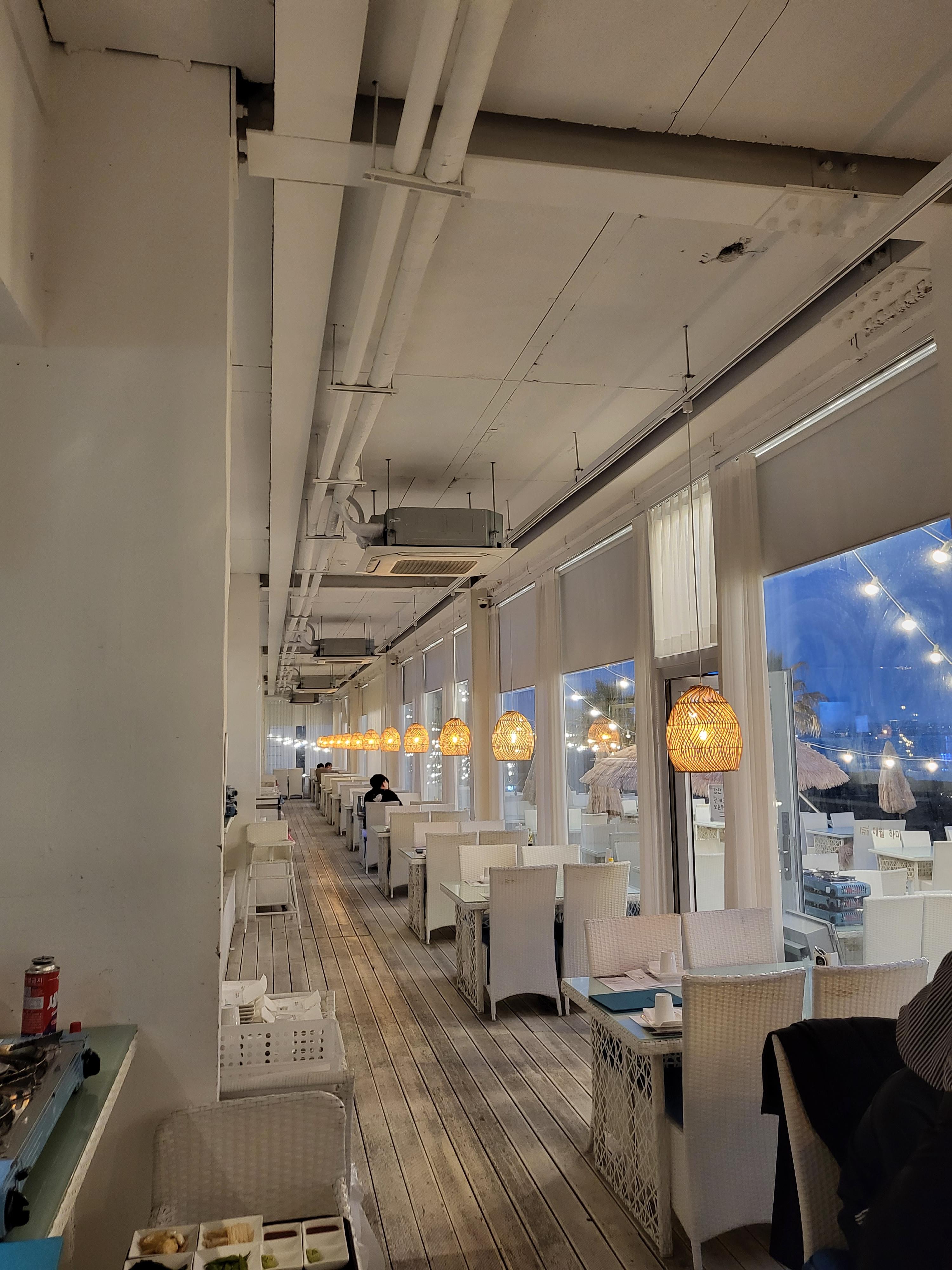 제주 애월 하미의 실외와 실내의 모습인데요. 실내도 저렇게 바다를 보며 먹을 수 있도록 창가자리가 있는데 식당 내부는 길게 쭉 뻗어 있는 구조라 특이하지만 많은 좌석에서 바다전망을 볼 수 있는 장점이 있는 것 같아요.