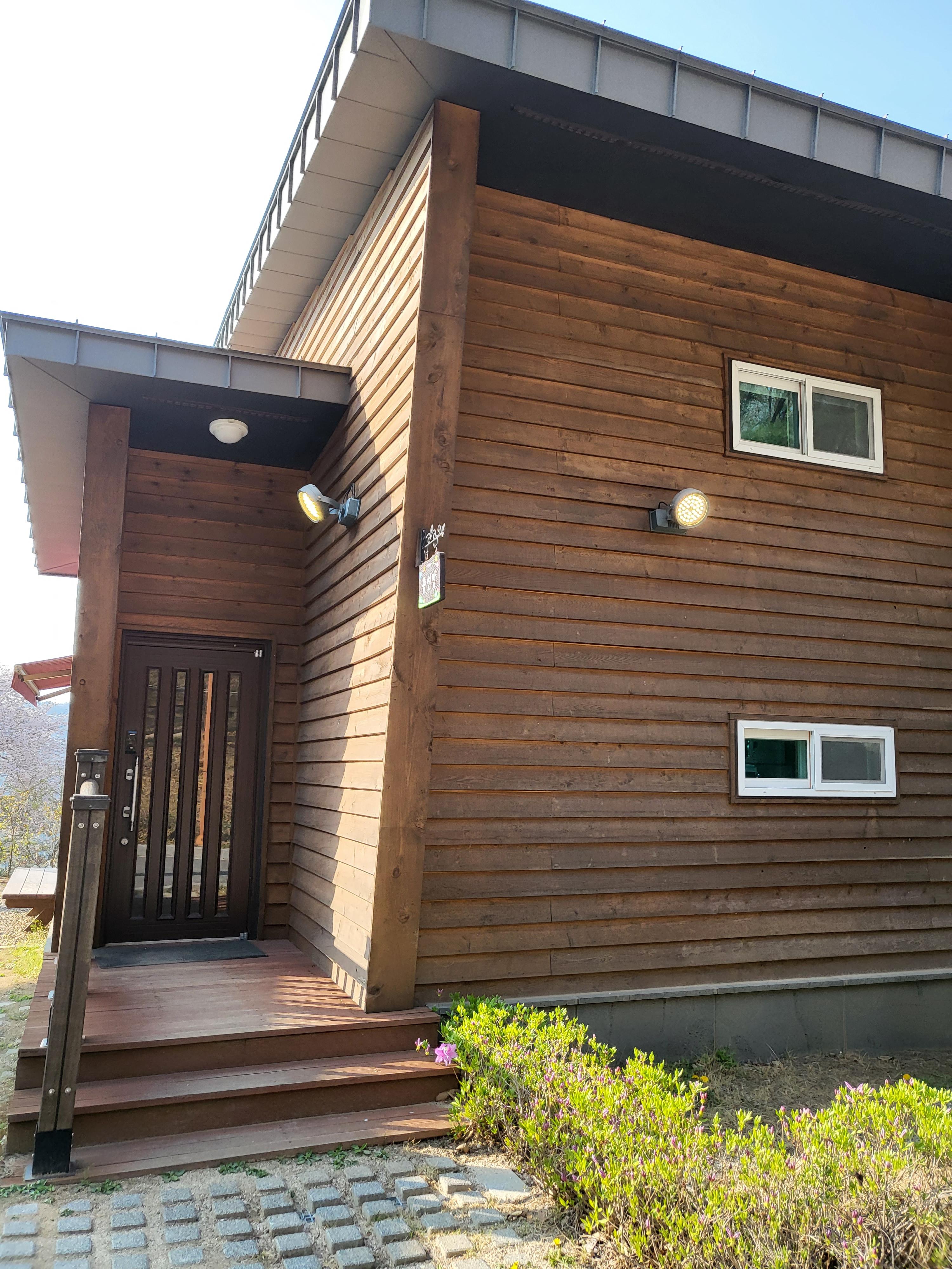 바깥에서 바라본 저의 숙소랍니다. 휴양림의 숲속의 집이라는 느낌보다 전원주택 단지 같은 느낌이 더 강하게 나죠?