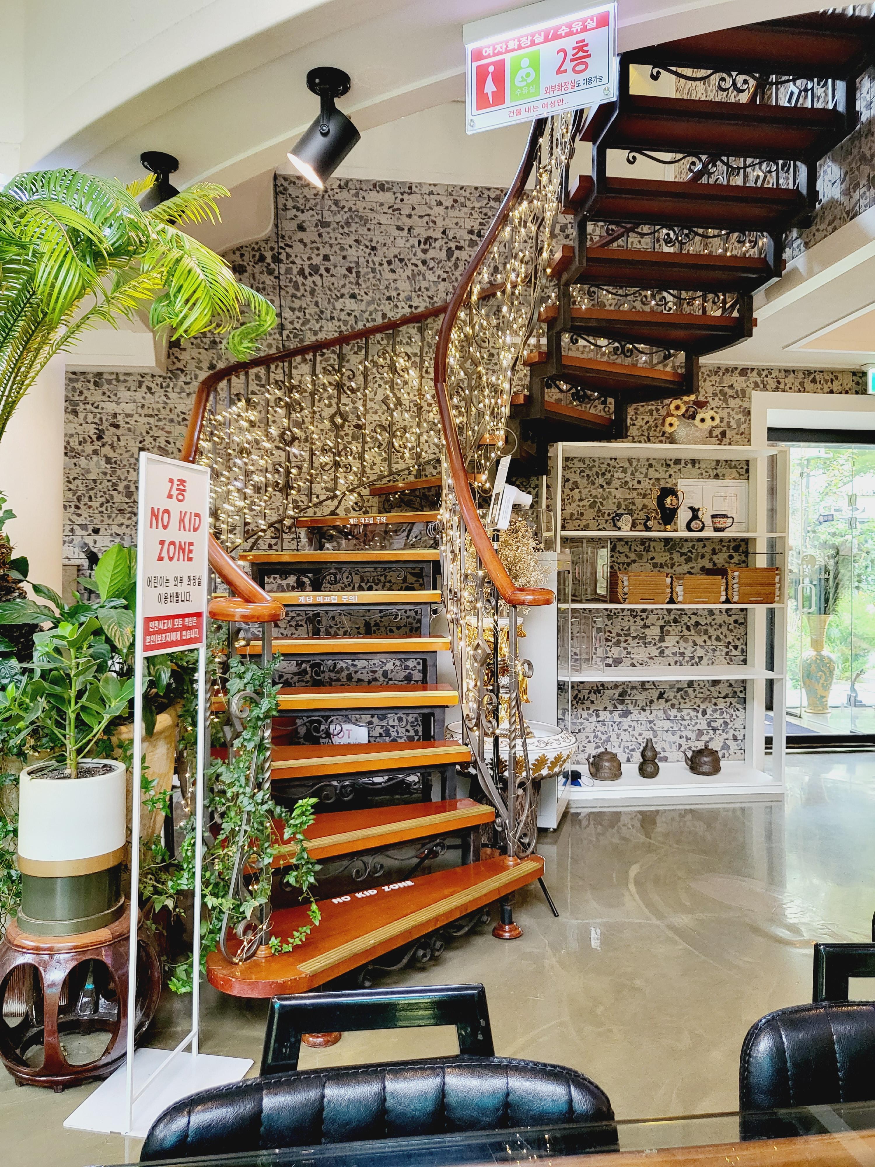 외부음식 반입금지라는 안내문과 카페안에는 식사를 할 수 있는 스테이크 음식점도 있네요.