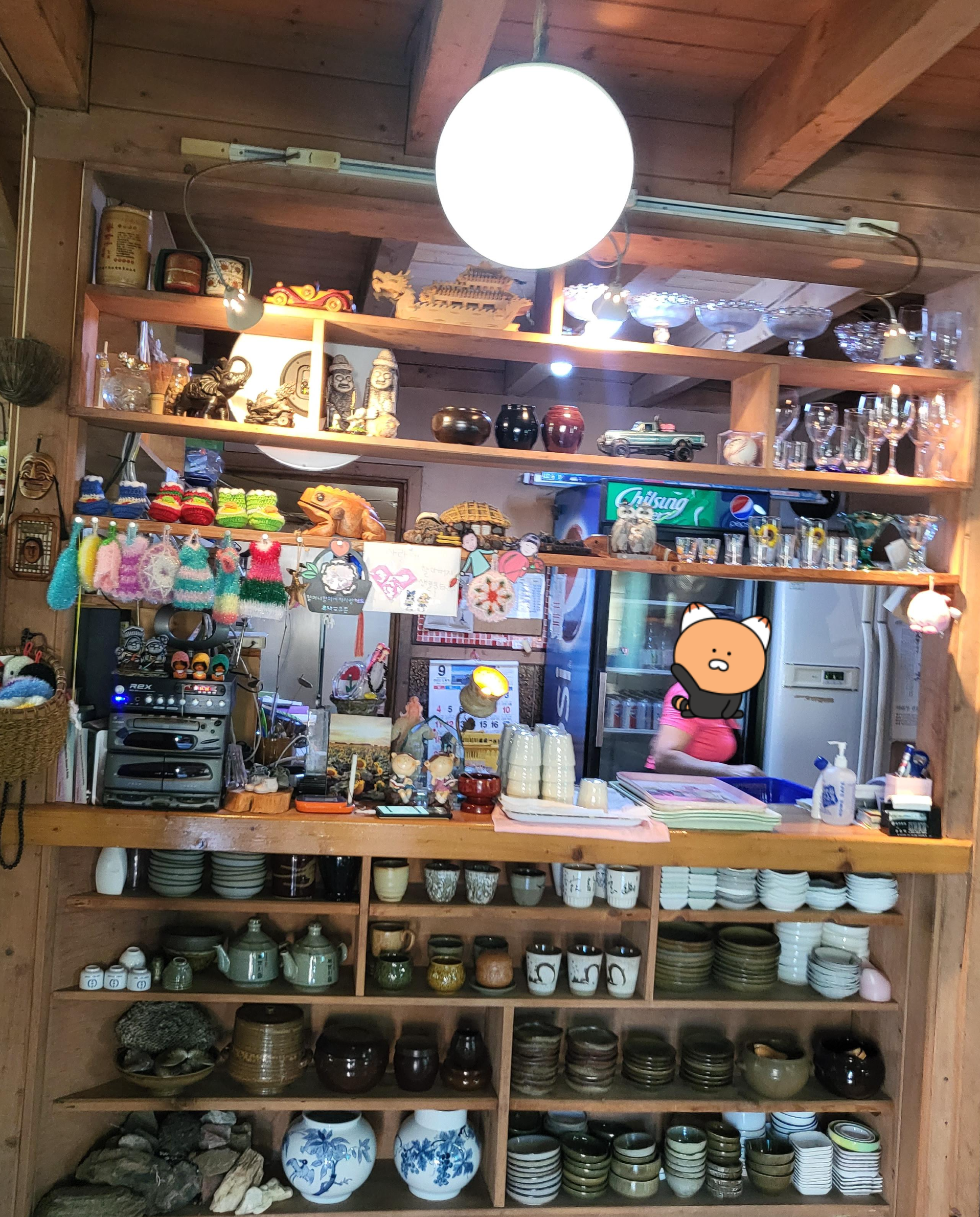 주방 입구에는 고풍스러운 식기류들이 참 많이 있네요. 식당 분위기와 잘 맞는 것 같아요. 확실히 주인분의 취향이 어떤 느낌인지 잘 드러나는 것 같아요.