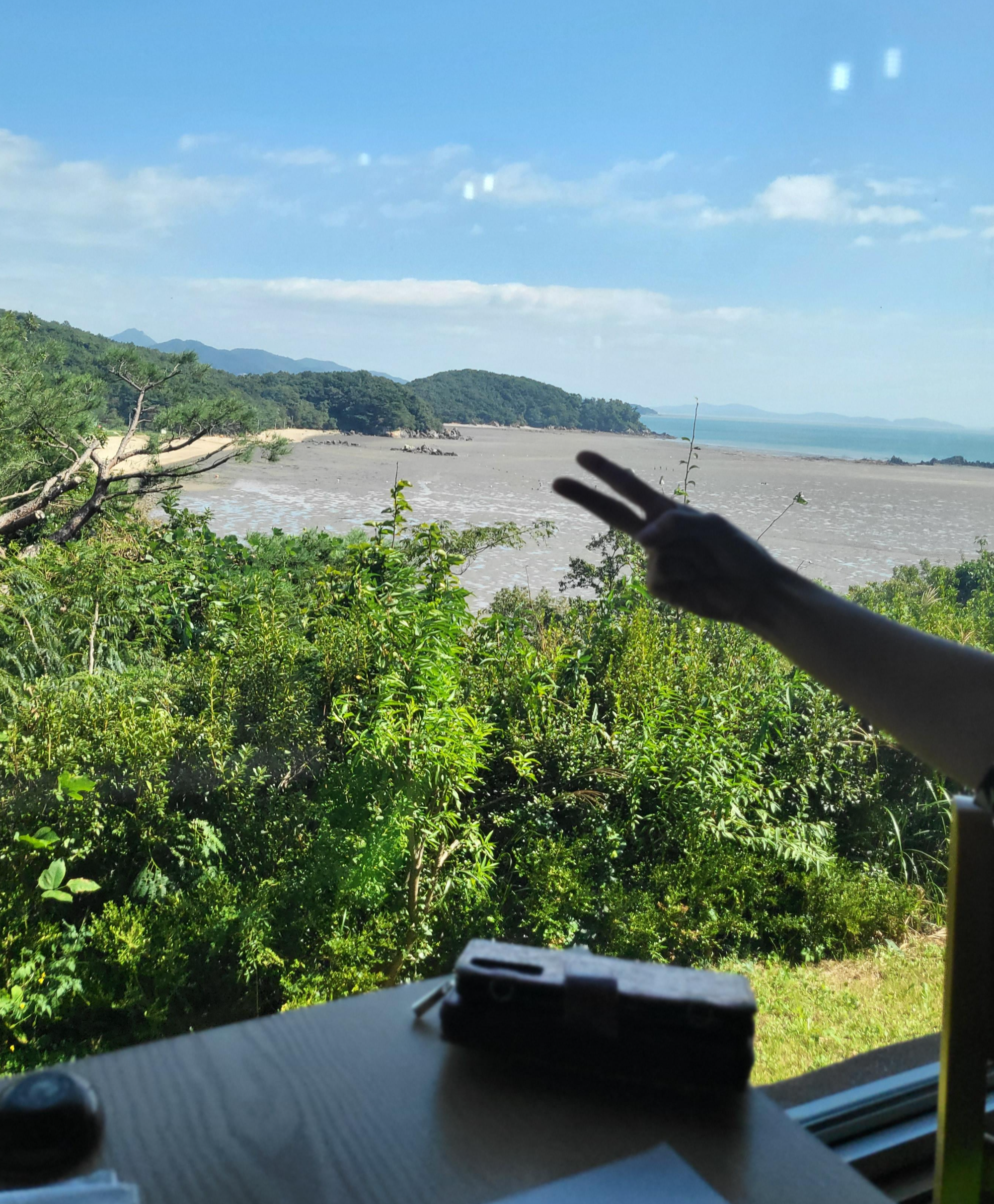 저희가 앉은 테이블에서 보이는 바다전망이에요. 민머루해변이 보이시죠? 바닷물이 빠진 갯벌에서는 사람들이 무언가를 캐고 있는 게 보이는데 보는 즐거움도 있어 저절로 힐링이 되는 것 같아요. 초록빛 바닷물이 참 이쁜데 서해도 이런 빛깔이 나는지 오늘 처음 알았네요.