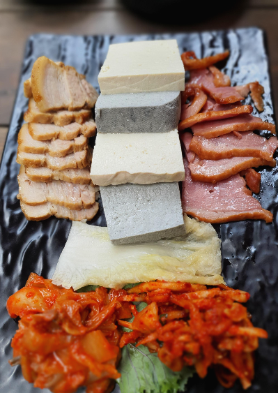 메인 요리인 두부와 보쌈. 오리훈제 고기예요.